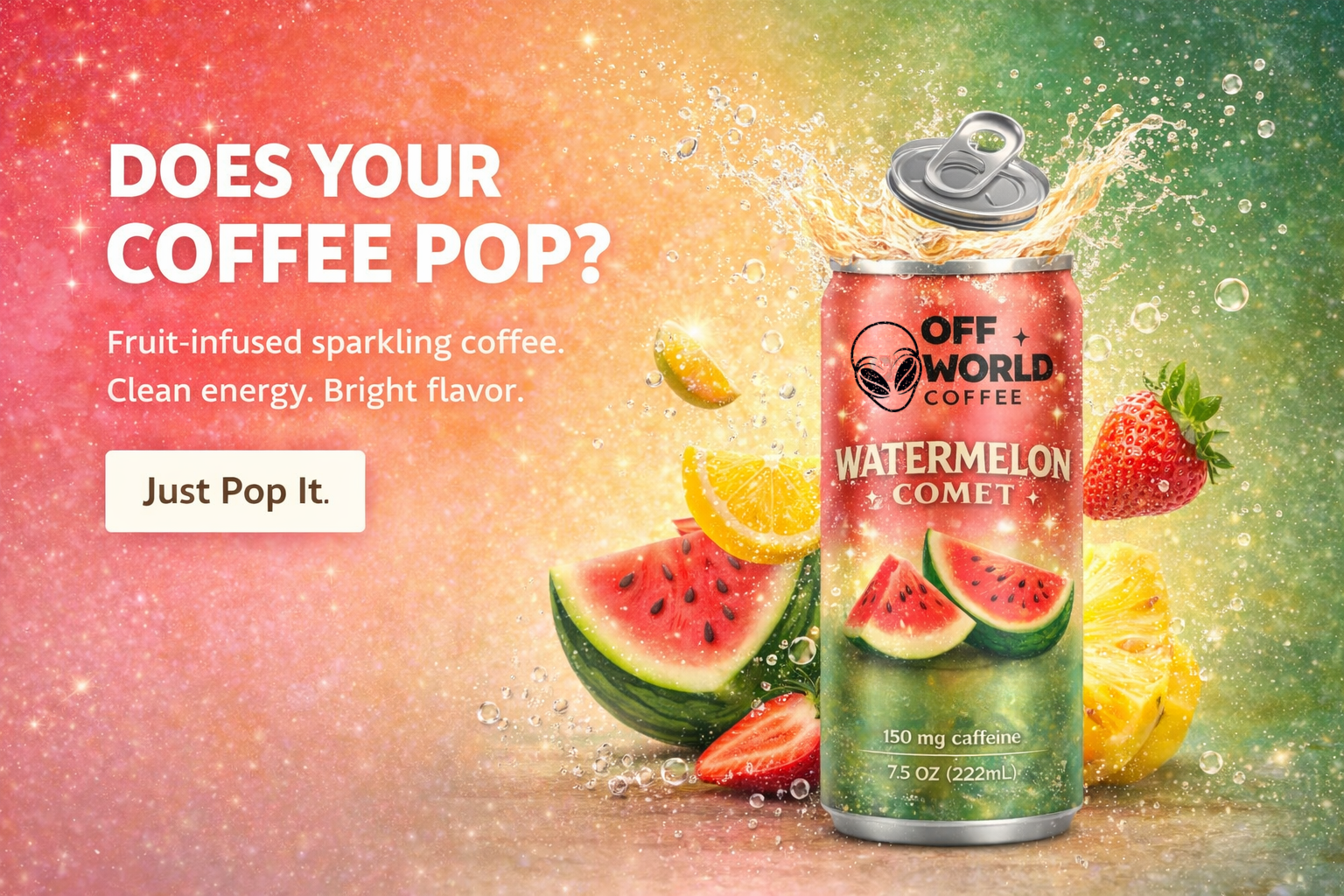 Offworld coffee is where crips bold cold brew meets your favorite poppi flavors. A refreshing , better for you coffee in a can, made with real coffee, real fruit flavors and tea's. It sips like a soda, caffeinates like an energy drink ad gives you the perfect energy shift-without sugar crash or chemical overload.